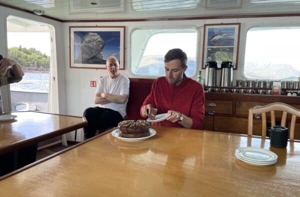 The boat has a large, bright and airy saloon with tables and seating as well as a covered outdoor seating area at the stern of the boat. Passengers are welcome in to the wheelhouse when the vessel is underway but will be asked not to visit when docking or dropping anchor. The upper deck is perfect for cetacean watching and bird spotting and many of our guests happily while away a few hours up on deck with binoculars.